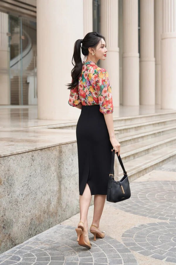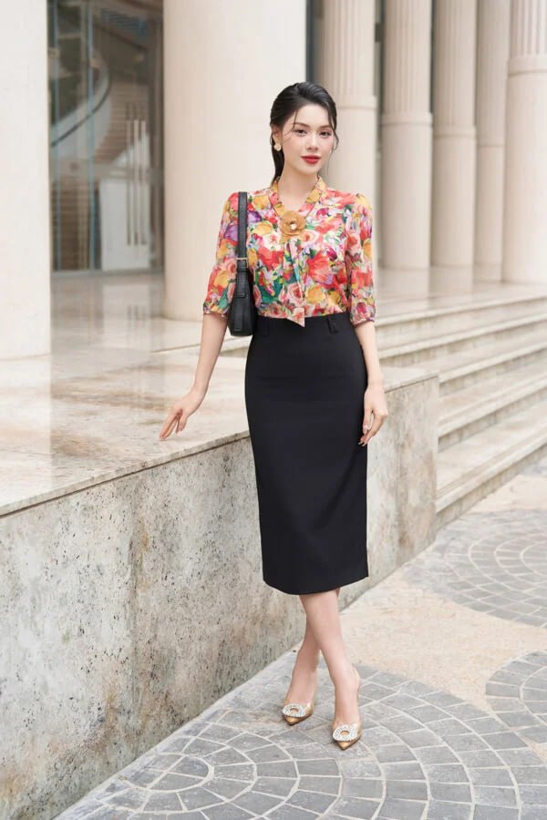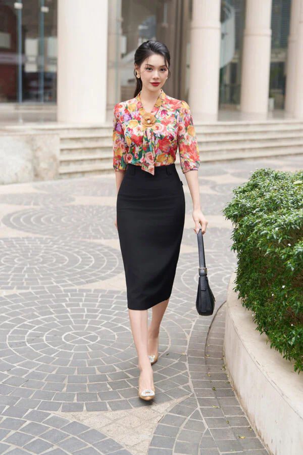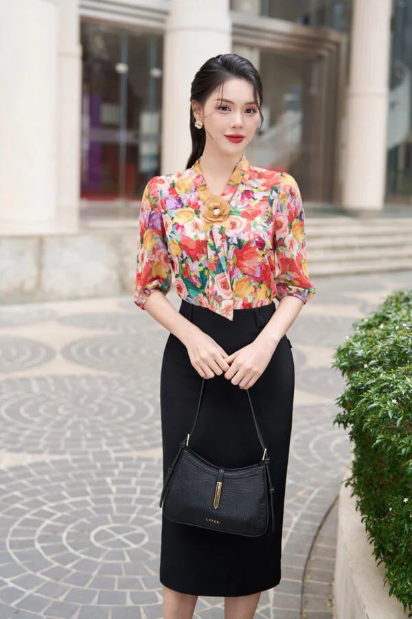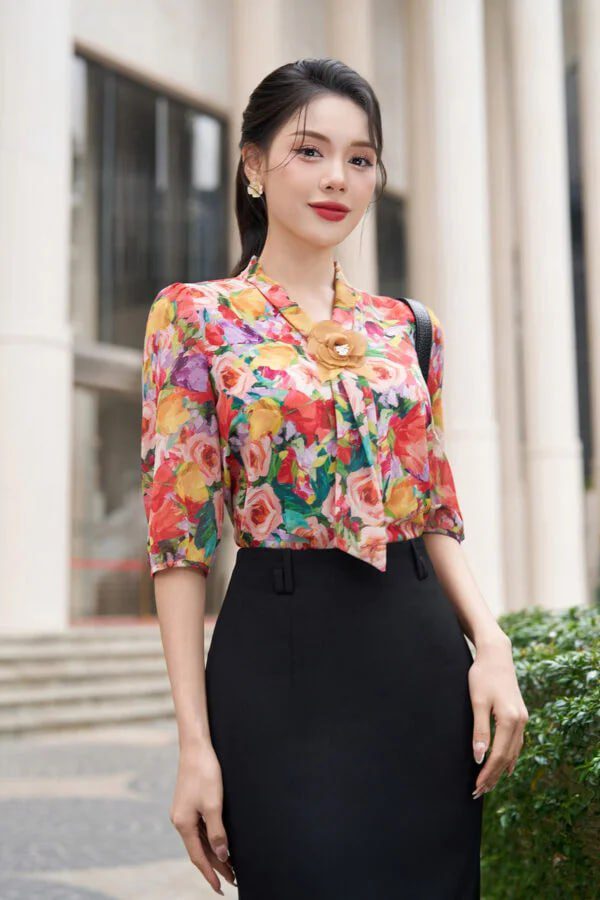 - Thiết kế độc đáo: Họa tiết hoa nổi bật, tay lỡ điệu đà, cổ áo tinh tế tạo nên điểm nhấn ấn tượng.