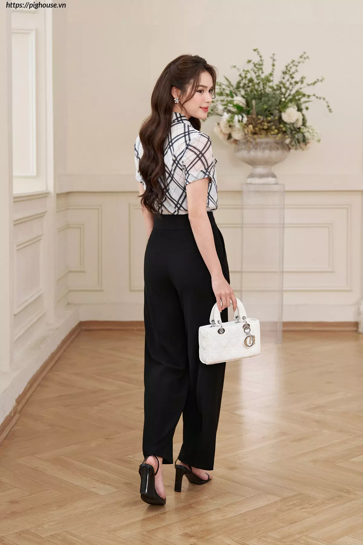 - Họa tiết kẻ chéo trẻ trung, tạo điểm nhấn cho trang phục.