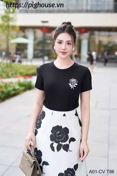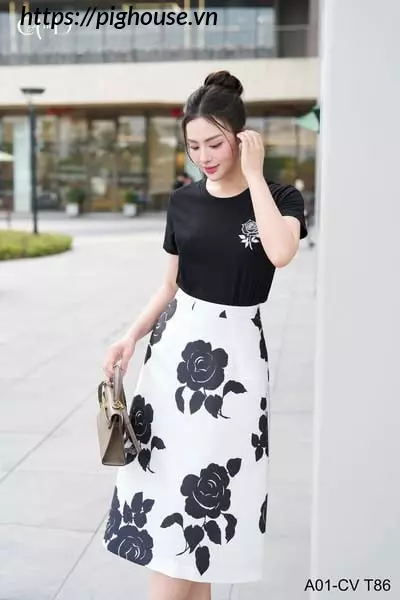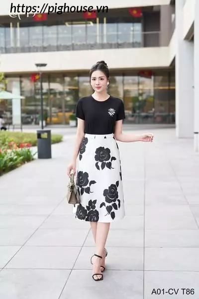 Chân váy A trắng hoa hồng đen tạo hiệu ứng thị giác nổi bật. Thiết kế giúp tôn dáng và che khuyết điểm một cách hiệu quả.