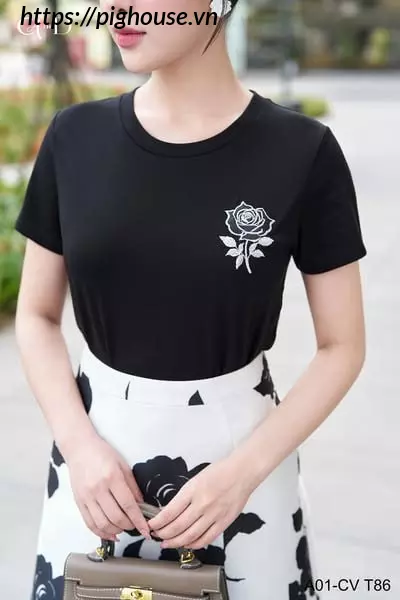 Áo thun cotton đen mềm mại, thoáng mát. Họa tiết hoa hồng thêu chỉ bạc ánh kim tạo điểm nhấn sang trọng.