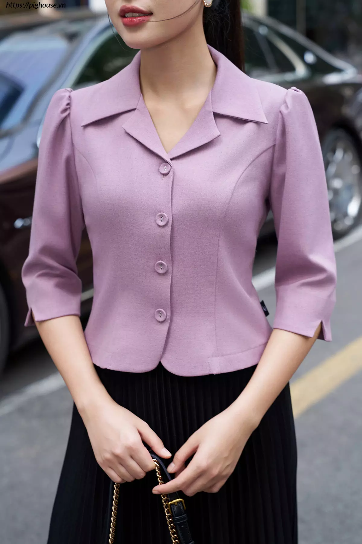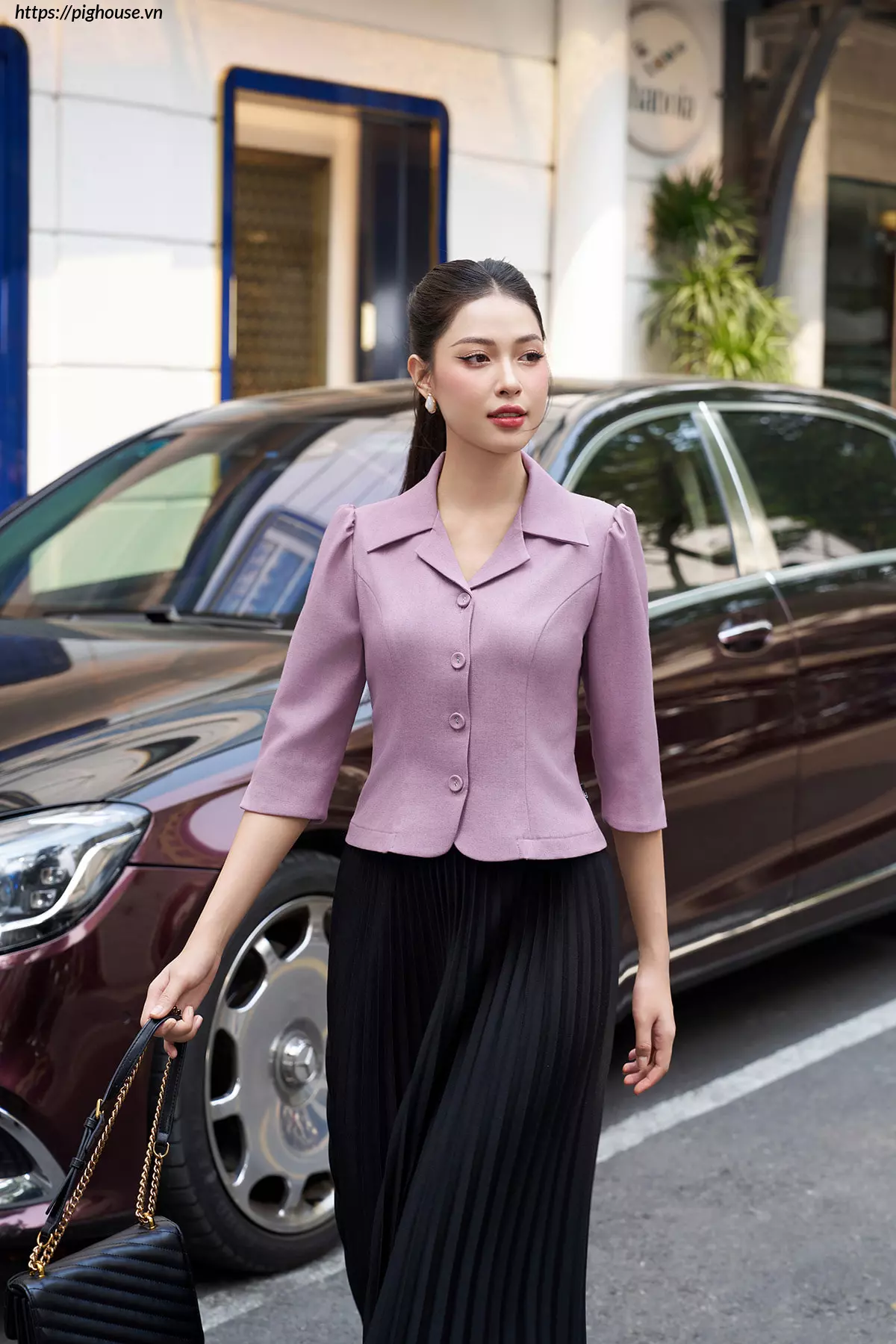 - Kiểu dáng thời trang: Cổ vest cách điệu mang đến vẻ ngoài hiện đại và cá tính. Tay lỡ trẻ trung, năng động.