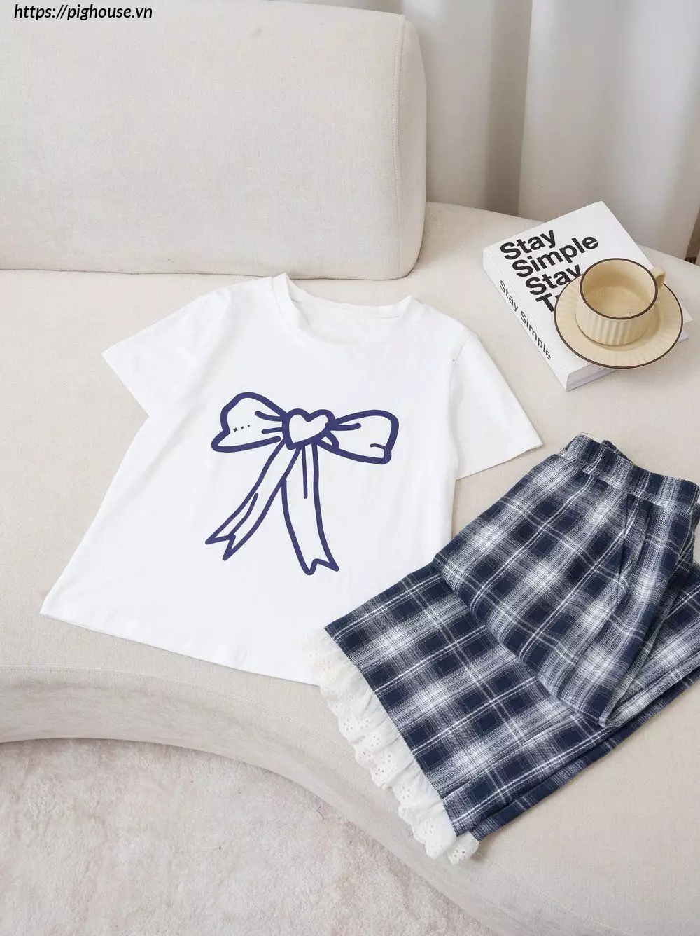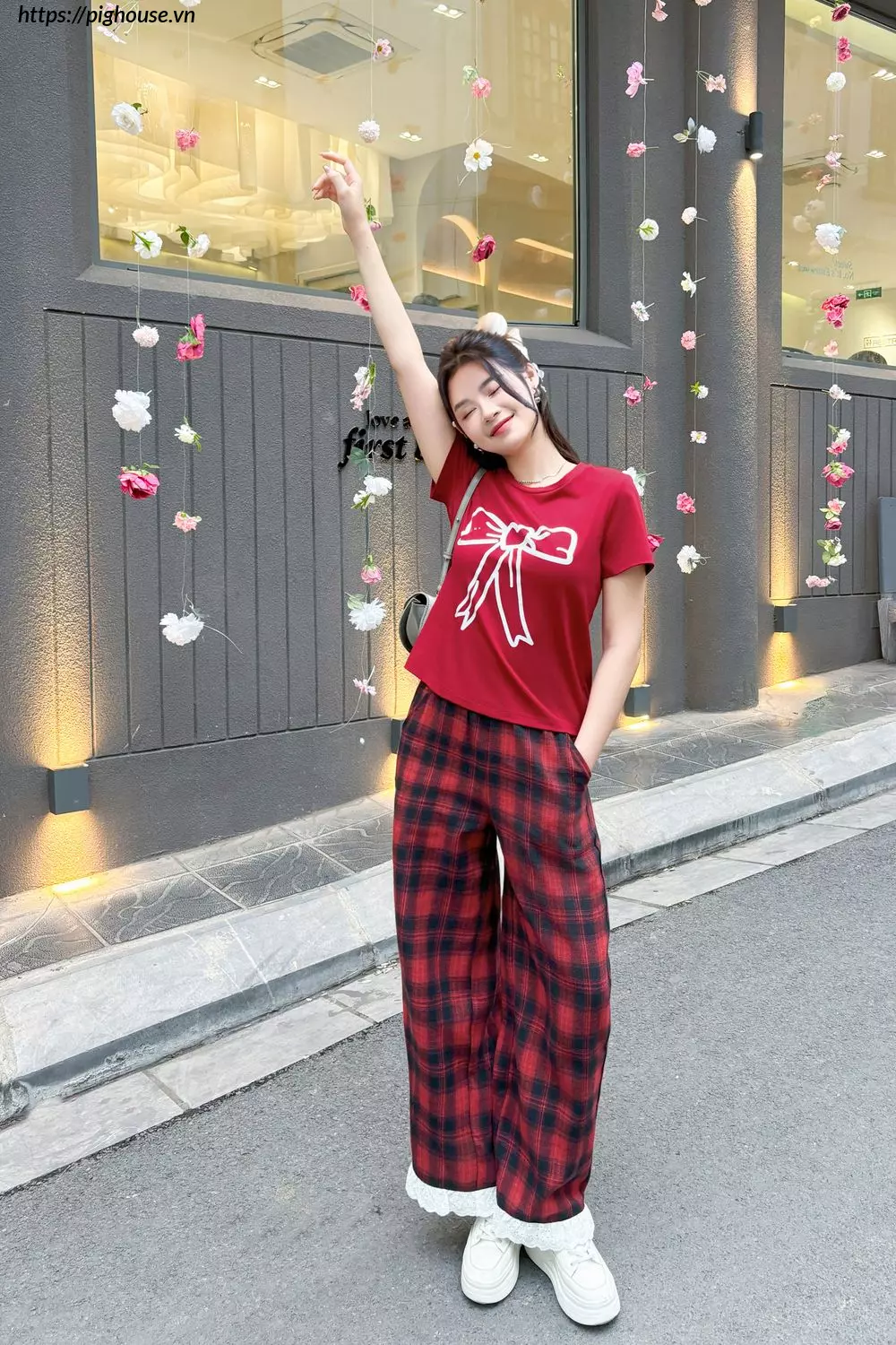 Áo ngắn tay giúp bạn thoải mái vận động. Quần kẻ gấu bèo tạo điểm nhấn điệu đà, nữ tính. Thiết kế này phù hợp với nhiều dáng người, giúp bạn tự tin khoe cá tính.