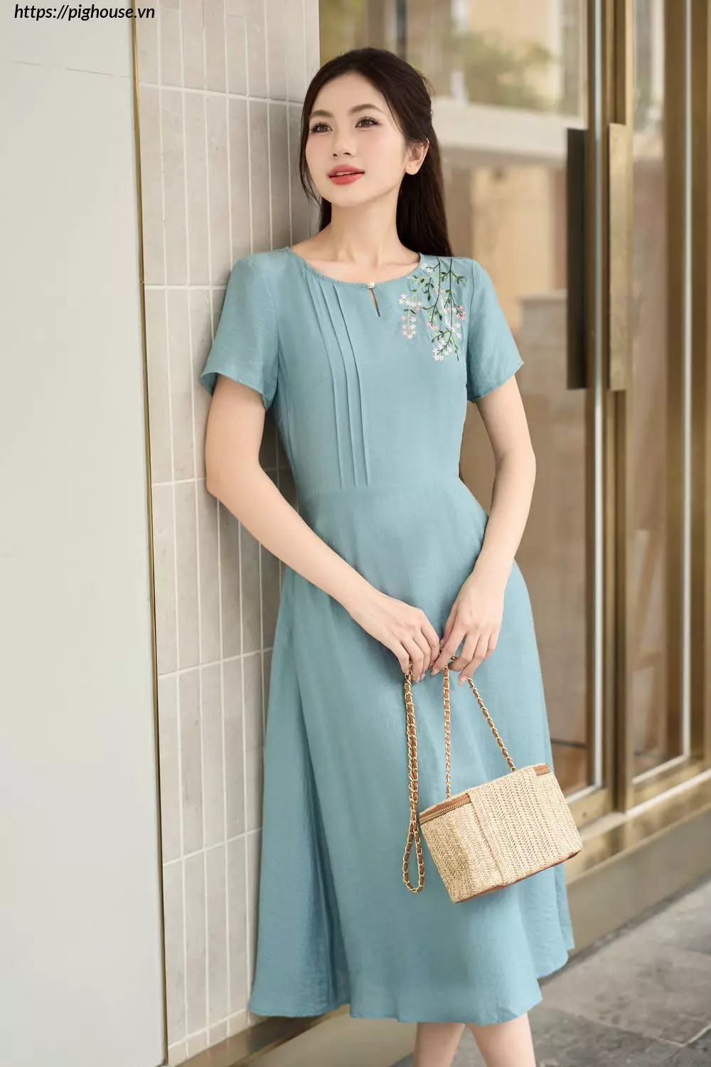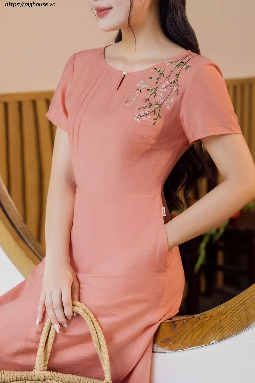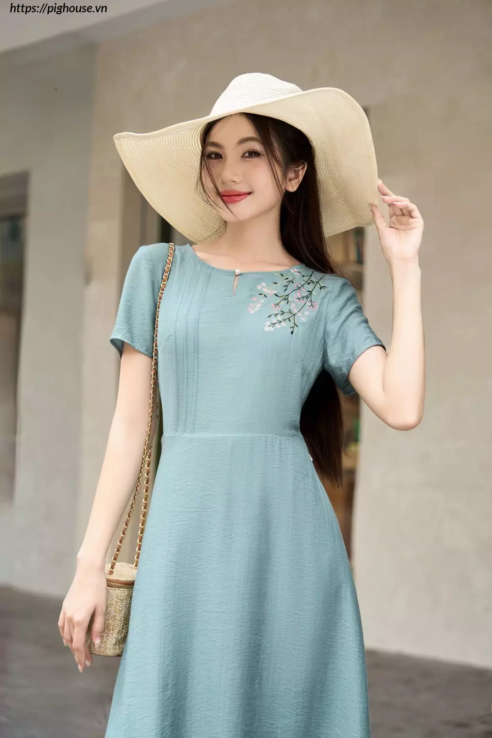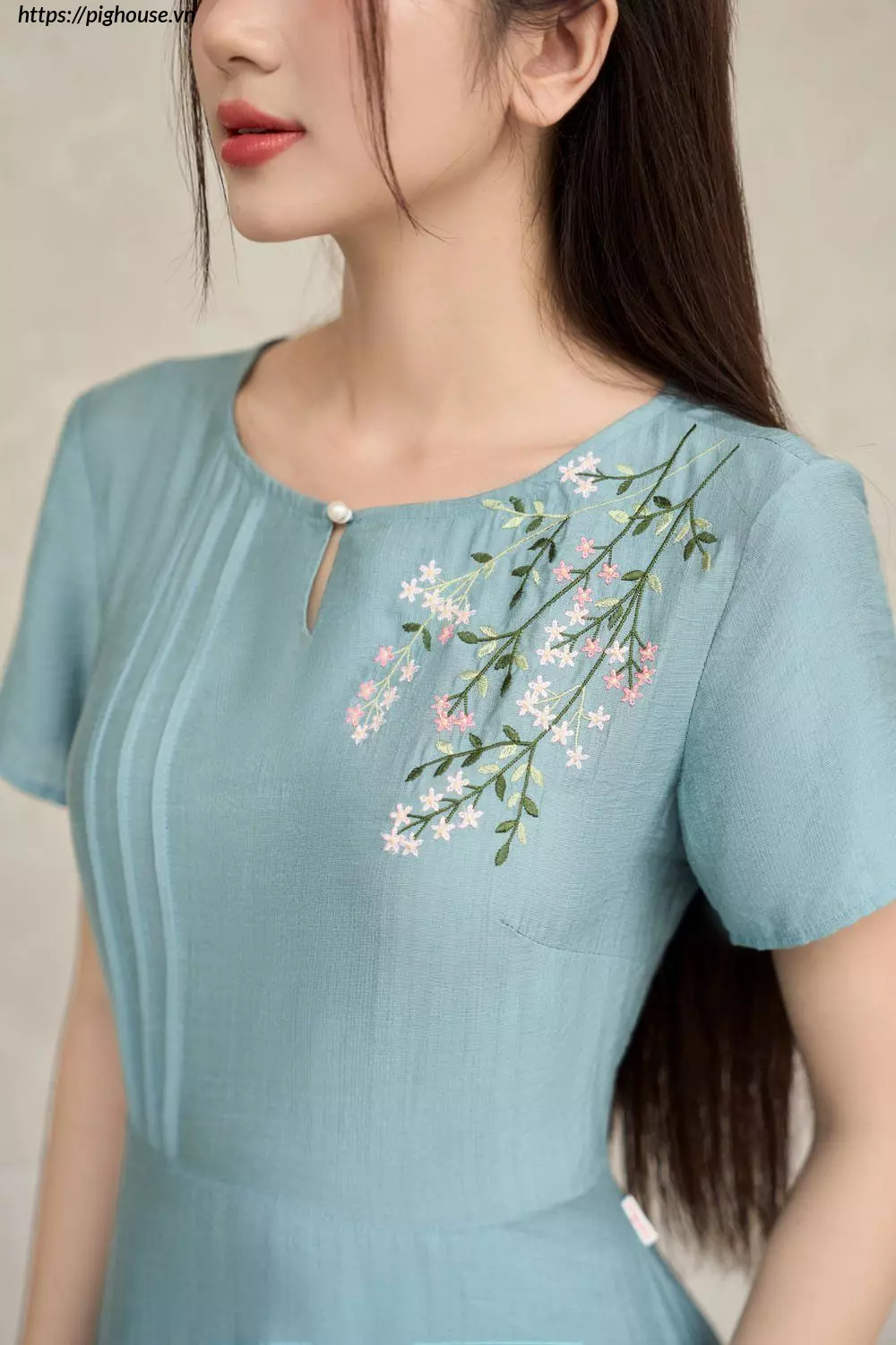 Đầm Đũi Thêu Hoa Vai Túi Sườn – Nét Đẹp Dịu Dàng Cho Nàng Thơ