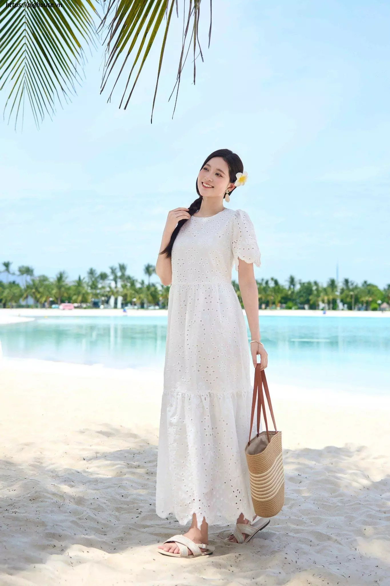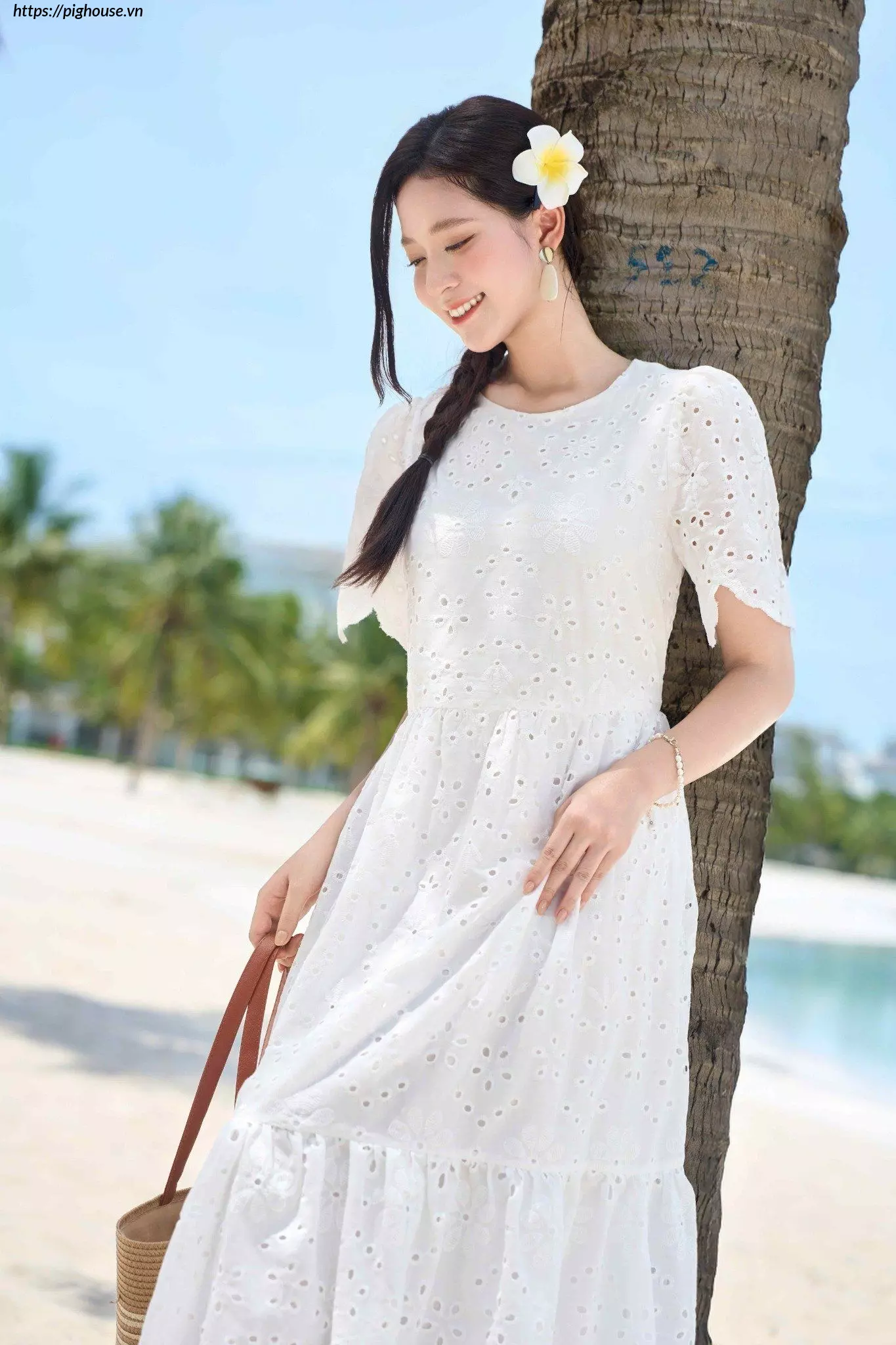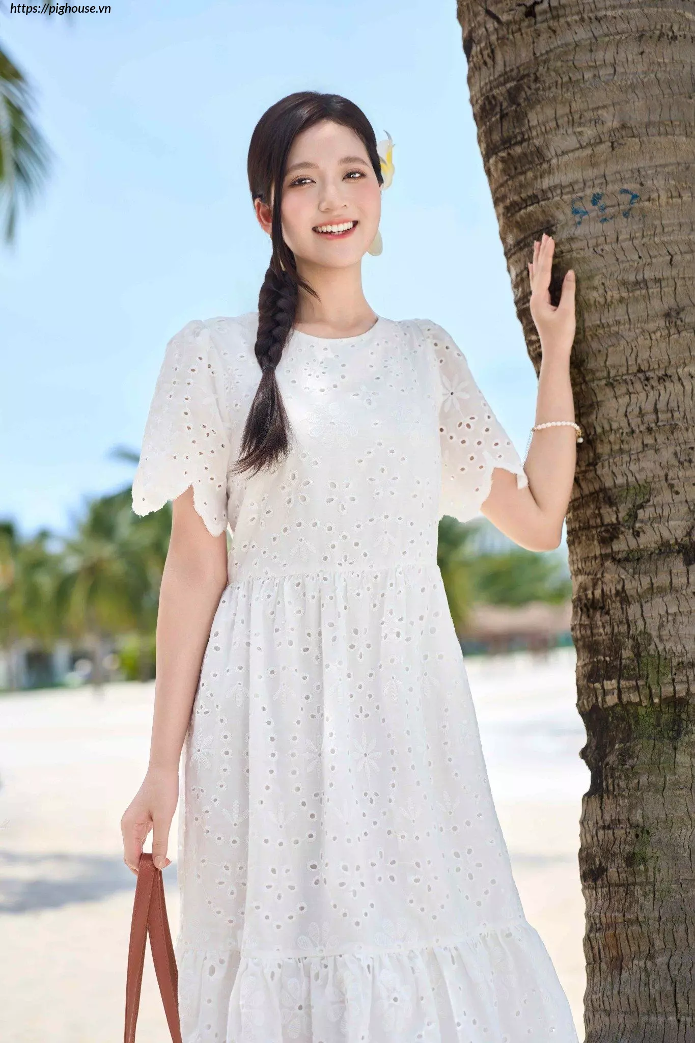 - Họa tiết thêu đục lỗ tinh tế: Điểm nhấn này giúp chiếc đầm trở nên độc đáo và thu hút hơn.