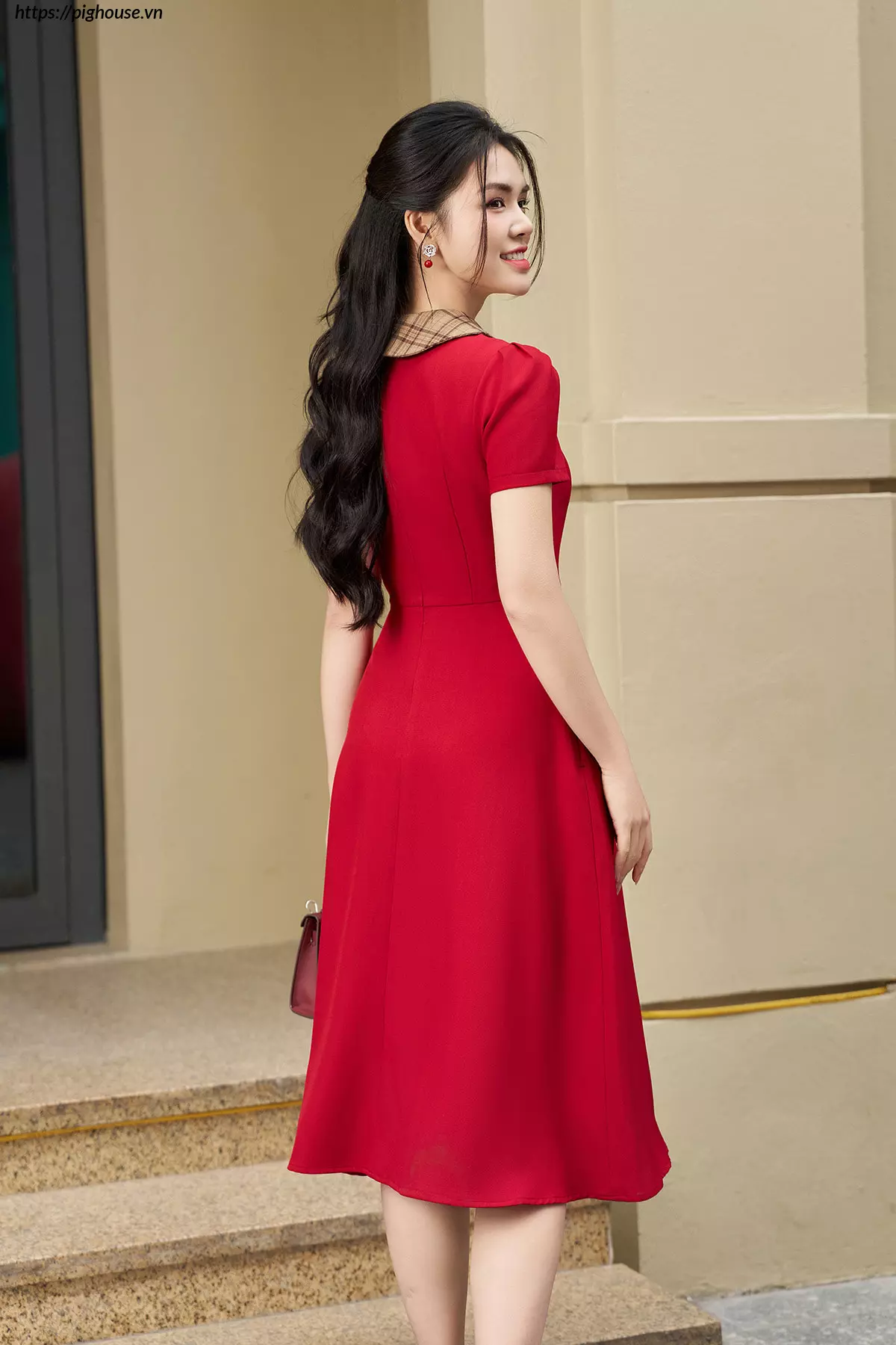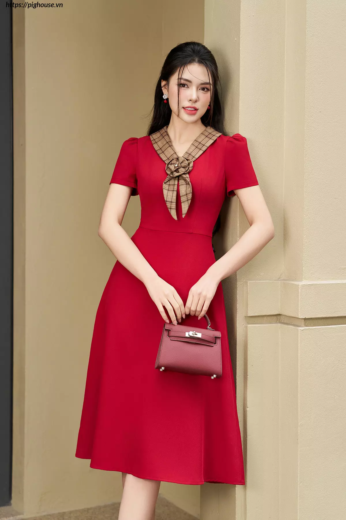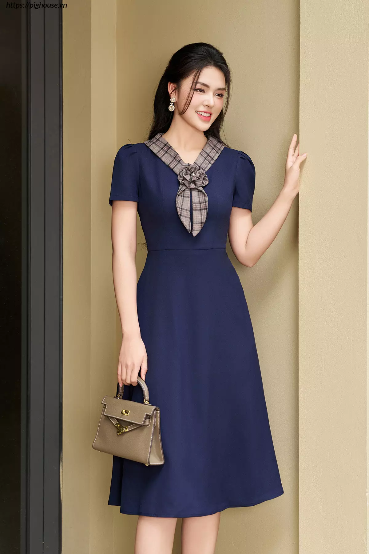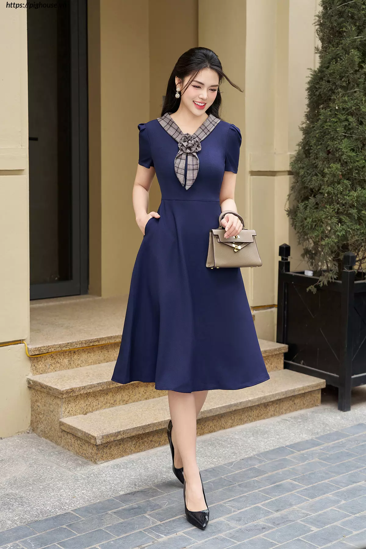 Đầm được thiết kế dáng xòe nhẹ nhàng, giúp che khuyết điểm và tôn lên vóc dáng của người mặc. Chi tiết nơ cổ duyên dáng tạo điểm nhấn, mang đến vẻ đẹp nữ tính và thanh lịch.