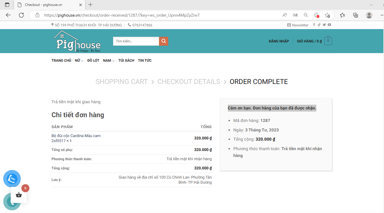 Cảm ơn Quý khách đã cho Pig House có cơ hội được phục vụ. Mọi thắc mắc cần được hỗ trợ vui lòng liên hệ 0763147866