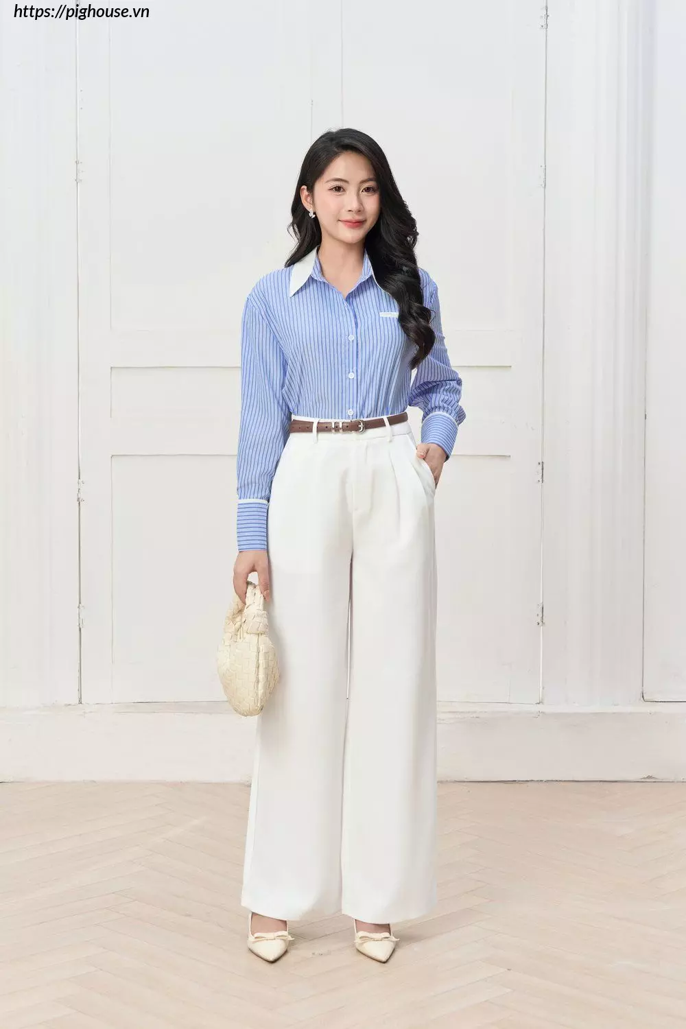 - Công sở thanh lịch: Kết hợp quần suông với áo sơ mi trắng và giày cao gót.